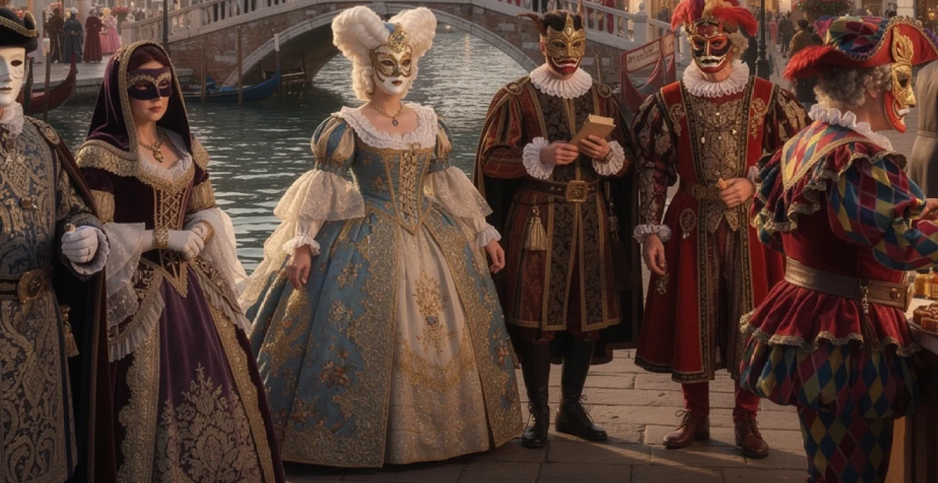 Colombina, servante vive et spirituelle, parfois masquée, parfois non, joue un rôle clé dans la dynamique amoureuse de ces intrigues comiques. Ses costumes, richement décorés, ont inspiré nombre de déguisements féminins lors du carnaval de Venise, où l’on retrouve ses volants, ses corsets et ses jupes colorées. En circulant des planches des théâtres aux calli et campielli, ces personnages ont fait du Carnevale une véritable scène permanente. Vous avez sans doute déjà croisé, en photo ou en vrai, un Arlecchino gesticulant sur un pont ou un Pantalone méditatif au bord d’un canal : autant de clins d’œil vivants à la tradition théâtrale vénitienne.